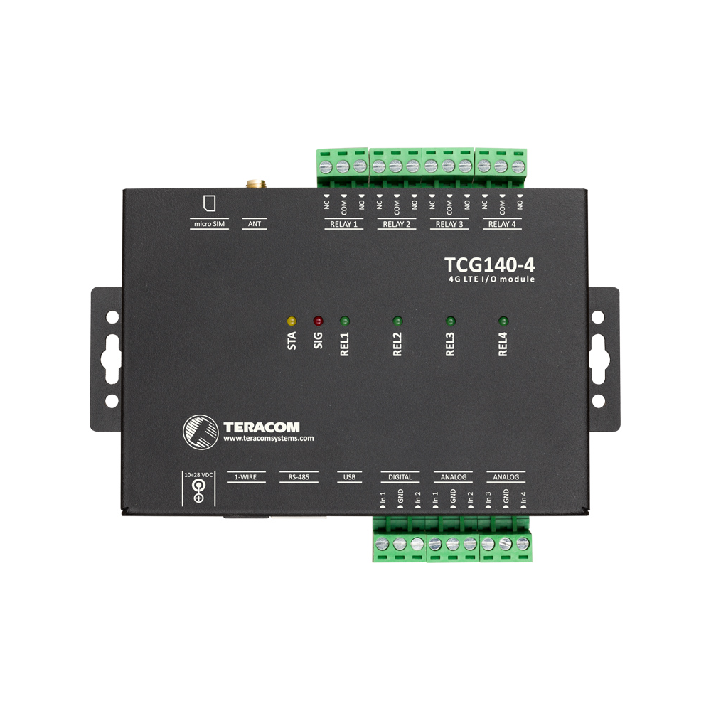 TCG140-4e ist ein 4G-LTE-Universal-IO-Modul. Das Gerät unterstützt auch 3G- und 2G-Mobilfunkkommunikation. Das Modul bietet digitale Ein- und Ausgänge sowie  analoge Eingänge mit 0-10 Volt oder 0-20mA. Darüber hinaus unterstützt das Gerät die MODBUS-RTU-Schnittstelle für alle kompatiblen Industriegeräte, einschließlich aller Teracom-Sensoren. Das Modul verfügt über ein robustes Metallgehäuse.
