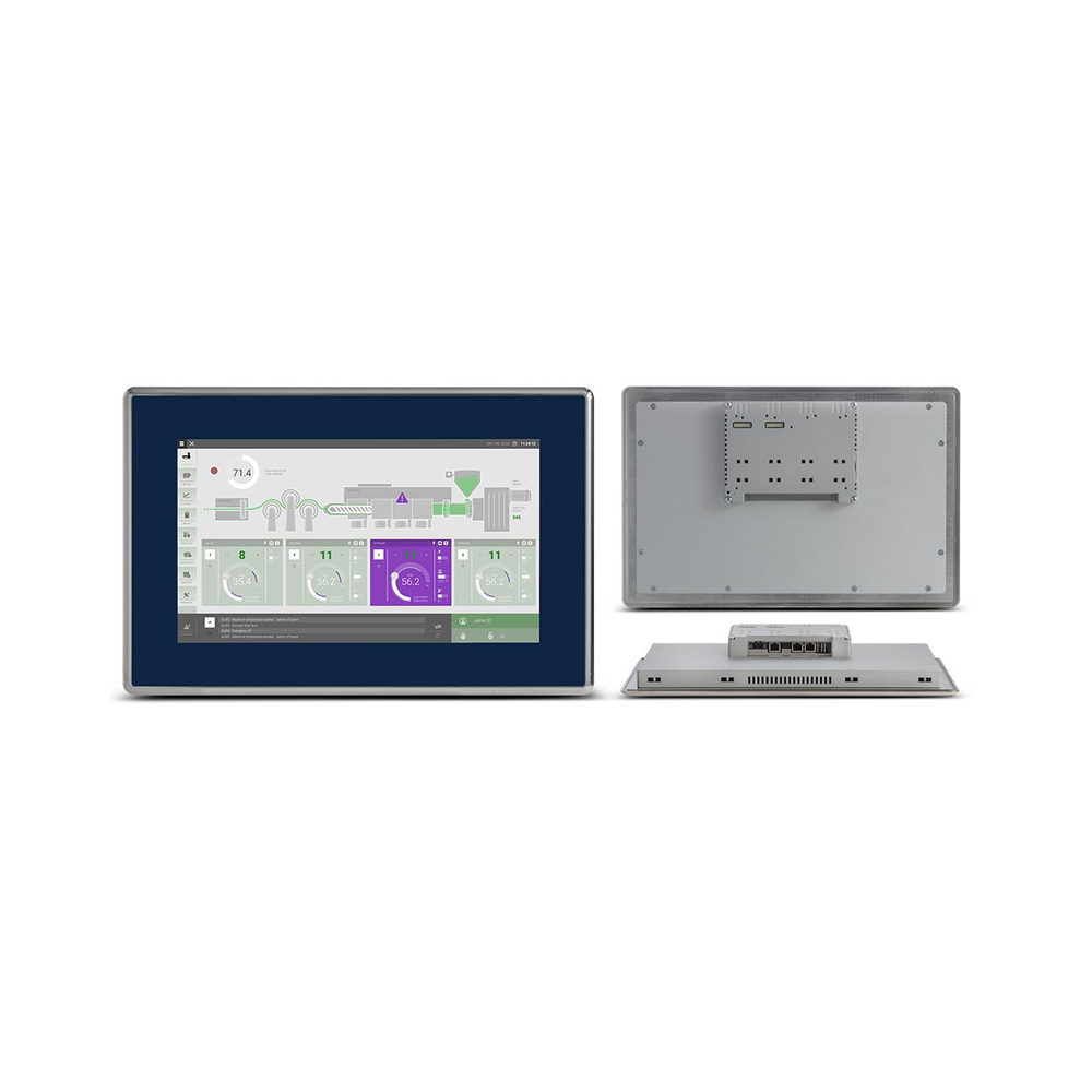 15.6” TFT Breitbild-Farbdisplay, Multitouch projektiv-kapazitiv touchscreen. 3 Ethernet-Ports, 1 serieller Anschluss, 2 USB-Anschlüsse. JMobile runtime.