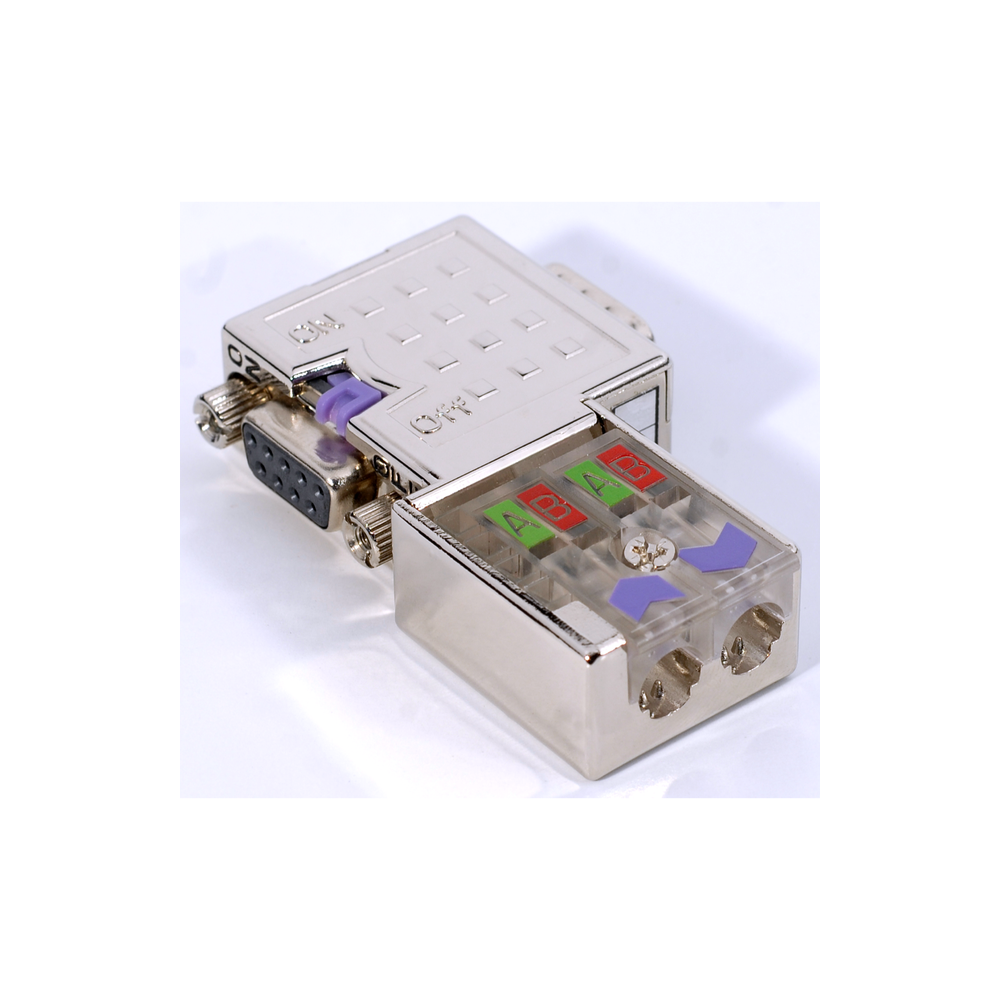 Der Vipa 972-0DP01 Profibus Stecker ist mit einem 90° Winkel angeordnet. Das Gehäuse entspricht Industriestandard. Der Abschlusswiderstand ist konfigurierbar.
