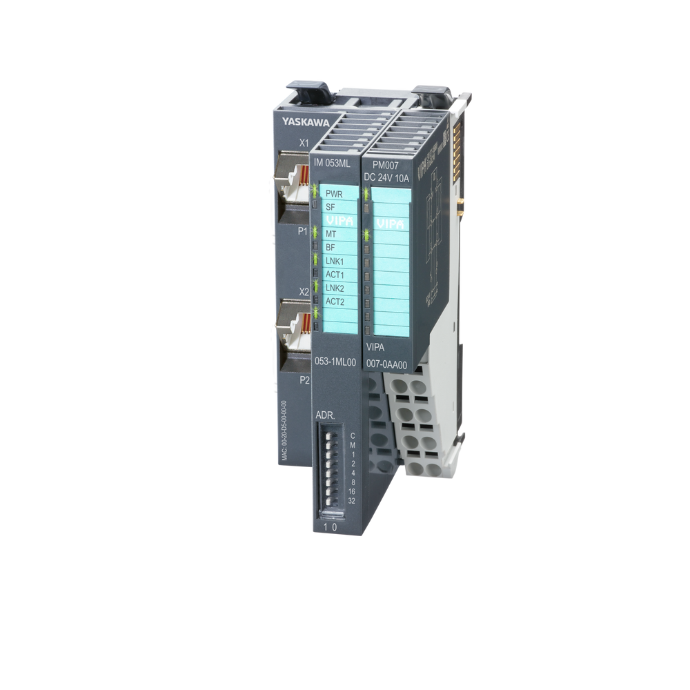 Das YASKAWA 053-1ML00 Modul ist ein Interface-Modul (IM). Beim Interface-Modul sind Bus-Interface und Power-Modul (PM) in einem Gehäuse integriert. Über das integrierte Power-Modul zur Spannungsversorgung werden sowohl das Bus-Interface als auch die Elektronik der angebunden Peripherie-Module versorgt. Am Interface-Modul können bis zu 64 Peripherie-Module betrieben werden.