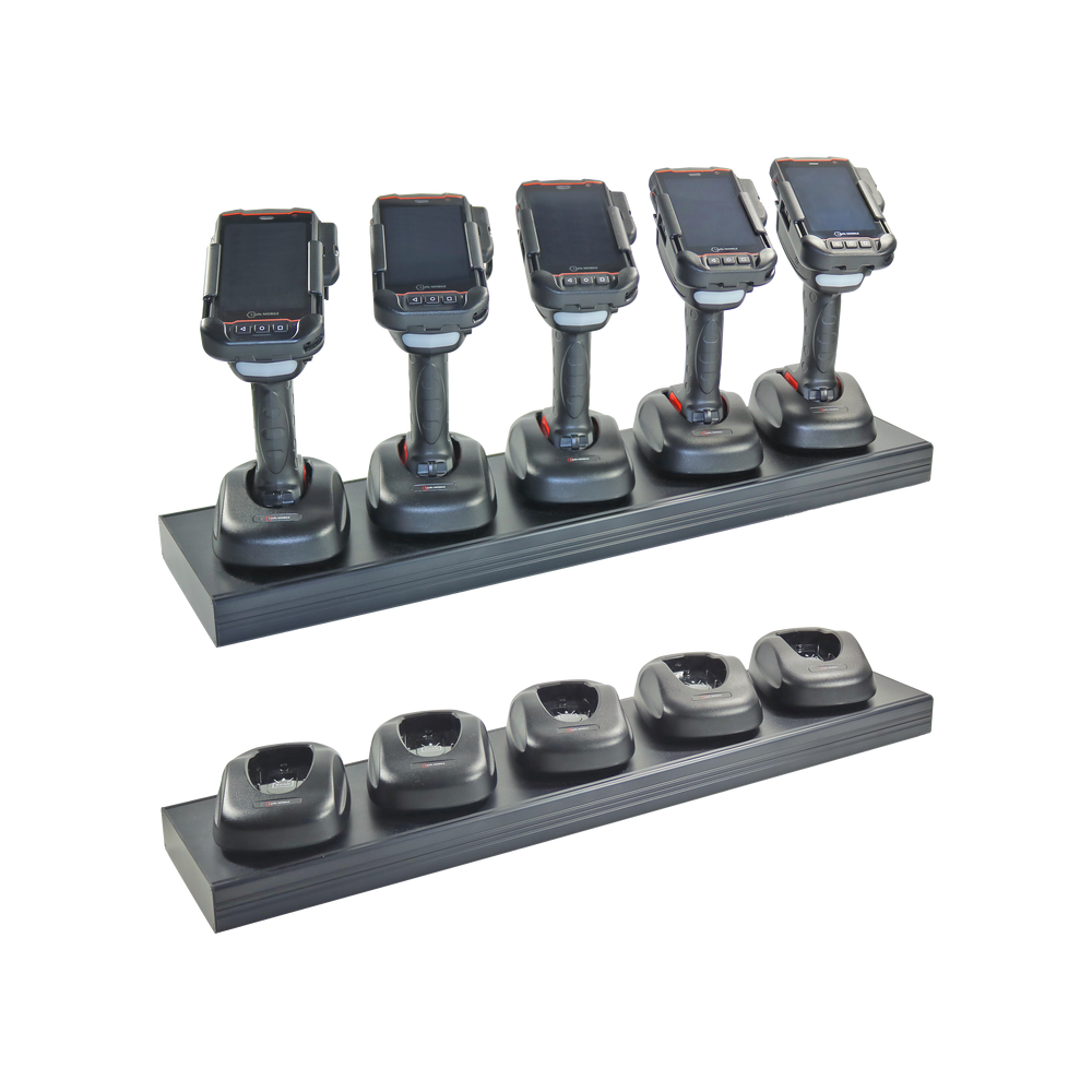 IS-MCTH1.1: The multi-charger solution for your trigger handle devices With the IS-MCTH1.1 Multi Charger Set, you can optimize charging management for your mobile devices in industrial environments. This multiple desktop charging station was specially designed to make charging efficient and convenient. The charging station allows you to charge up to five i.safe MOBILE devices (e.g., IS530.1 or IS540.1) simultaneously while mounted in the trigger handle (IS-TH1xx.x and IS-TH2ER.1). The laborious removal of the smartphone from the trigger handle before each charging session is no longer necessary, saving valuable working time. Each of the five charging slots has its own charging indicator that shows you the status of the respective device at a glance. With its compact dimensions of 654 x 165 x 90 mm, the charger fits perfectly on any desktop or charging station. The IS-MCTH1.1 is the ideal solution for companies that require a reliable, centralized, and time-saving charging option for their IS-TH1xx.x and IS-TH2ER.1 device fleets. Maximize your productivity and keep your devices ready for use at all times.