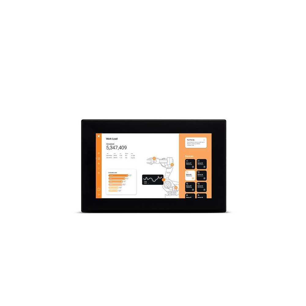 15.6" TFT widescreen colour display, multitouch projective capacitive touchscreen. 3 Ethernet ports, 1 serial port, 2 USB ports. Chromium-based HTML5 browser