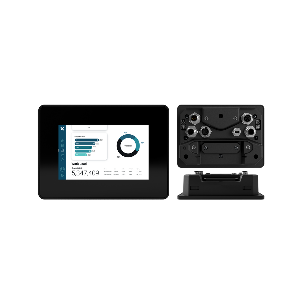 5" TFT colour display, multi-touch projective capacitive touchscreen. 2 Ethernet ports, 2 CAN ports, 1 SSR, WiFi, 1 serial port, 1 USB ports. JMobile runtime. Optional: CodeSys PLC, Corvina Cloud