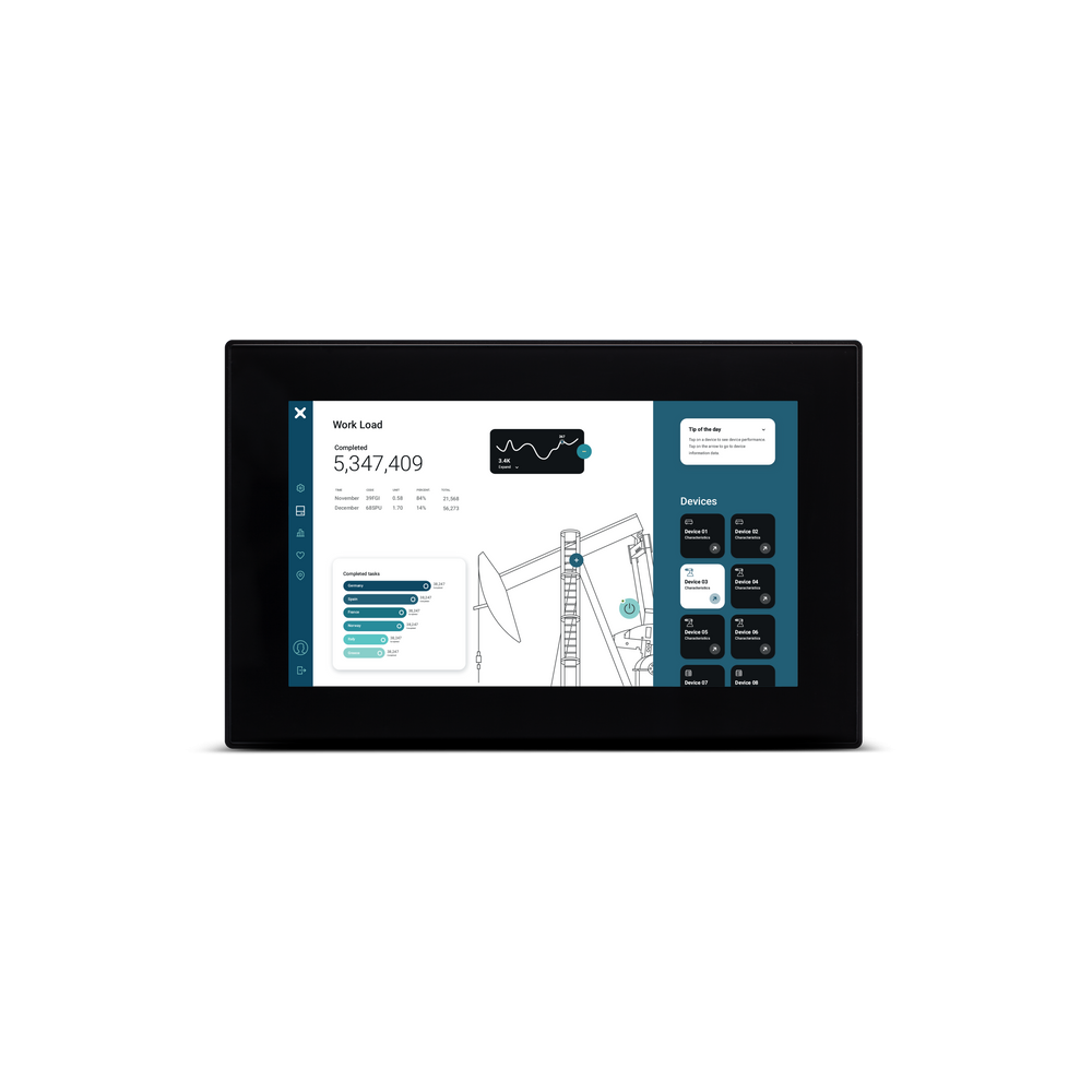 15.6" TFT widescreen colour display, multi-touch projective capacitive touch screen. 3 Ethernet ports, 1 serial port, 2 USB ports. Chromium-based HTML5 browser