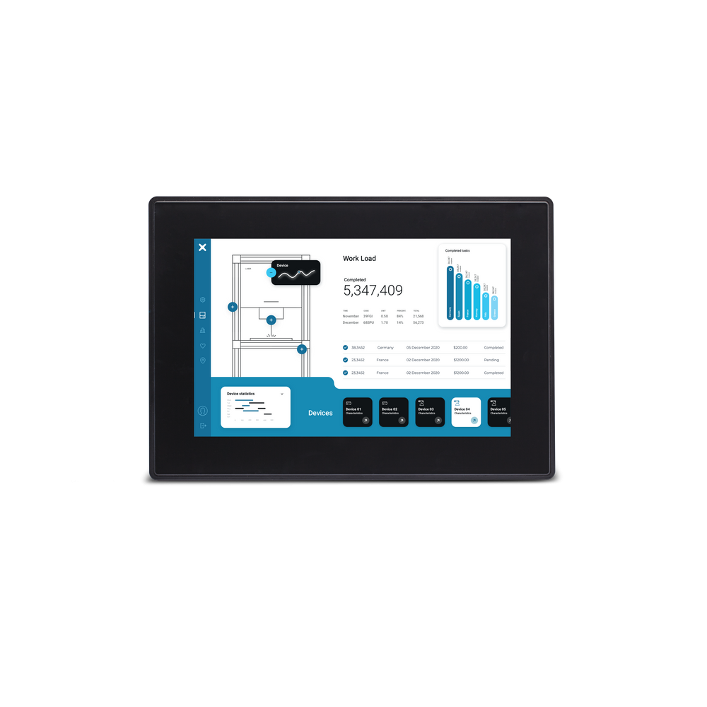 10.1" TFT widescreen colour display, multi-touch projective capacitive touch screen. 3 Ethernet ports, 1 serial port, 2 USB ports. CODESYS V3 with Ethernet I/O stacks. Fast system and project boot-up.