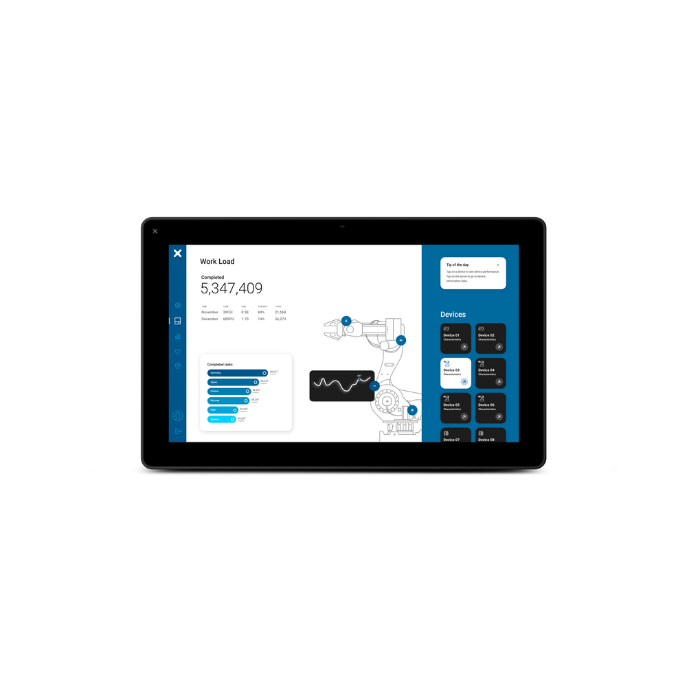 The EXOR JSmart715M is the perfect panel for all IoT edge applications in industry and building automation. The panel impresses with its powerful processor and the following unique selling points: - PoE connection, Wi-Fi interface and NFC device. - Multitouch display and robust glass front panel - Full set of motion and environmental sensors - Ready-to-install with mounting arm, IP67 all around - JMobile Runtime