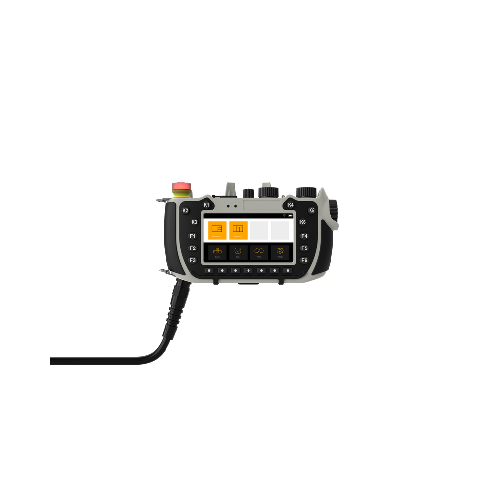 The X5 Mobile HMI is a safety-tested device with a compact and lightweight design. The illuminated emergency stop button leads to great operator safety. The integrated devices (keypad, potentiometer, handwheel) can be fully programmed, enabling fast and individual use. X5 is fully programmable with JMobile. Equipped with a 5" display, a resistive touch screen and a multi-touch interface, it allows intuitive operation and offers a great user experience. user experience.