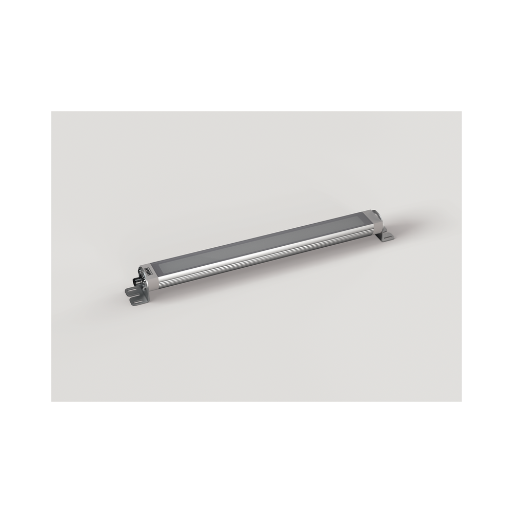 The LR40 series is an additional alternative to the L/LO series. By processing robust materials such as anodised aluminium and safety glass as well as using an extremely chemically resistant adhesive, the LR40 not only withstands splash water, metal chips or lubricating oils, but also all cooling lubricants commonly used in machine and plant construction. Like the L/LO, the luminaire can also be rotated at will via mounting brackets and is available with a built-in 30° or 60° lens, thus enabling the light to be focused on a specific area. The LR40 is therefore the perfect luminaire for machine tool construction, as its properties meet exactly the requirements set in the industry to a machine lamp. Due to its wide range of properties and configuration options, such as different light temperatures, types of cover, optics and length variants, the LR40 is a true all-rounder among industrial luminaires. It is therefore also suitable for use in sectors such as packaging machines, woodworking machines, printing machines, food processing machines, plastics processing machines, etc. In our successor model, the Eco mode is, of course, also a fixed component. Here, too, the illuminance can be reduced to 30 % by PWM signal. The enlarged cross-section of the conductor paths on the printed circuit boards makes it possible to cascade up to four LR40 luminaires of the longest version. This means that machines can be illuminated over a length of approx. five metres with just one voltage source.