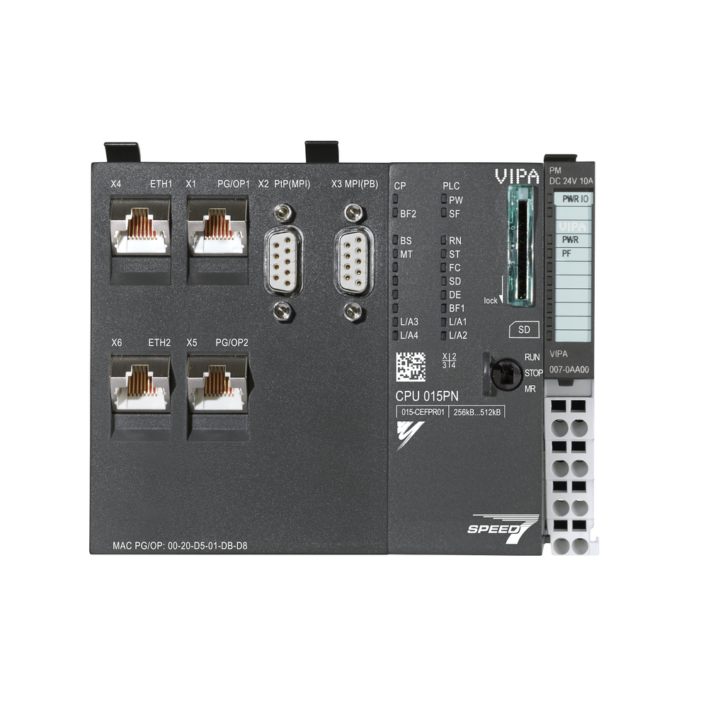 Work memory [KB]: 256...512 Integrated PROFINET controller Interface [2x RJ45]: PROFINET, ModbusTCP Master/Slave, openCommunication Interface [2x RJ45]: active Ethernet PG/OP communication with DHCP support, switch Interface [2x RS485]: MPI, PtP: ASCII, STX/ETX, 3964(R), USS master, Modbus master/slave Optional: PROFIBUS master/slave Web server SD card slot with locking, up to 64 expansion modules, configurable with SPEED7 Studio, SIMATIC Manager and TIA Portal