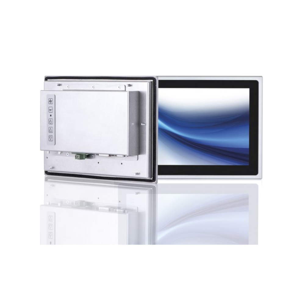 Moniteur intégré robuste et disponible à long terme avec PCAP (Multi-Touch). La face avant est sans arêtes ni marches, plate, lisse et sans aspérités contre la saleté ou la poussière. Fixation par pinces ou VESA.