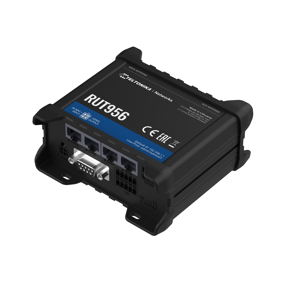 RUT956 est un routeur cellulaire professionnel double SIM 4G / LTE et WiFi robuste. Cet appareil industriel hautement sécurisé et fiable est équipé d'interfaces Ethernet, numériques et analogiques, RS232, RS485, GNSS (GPS), microSD et USB.