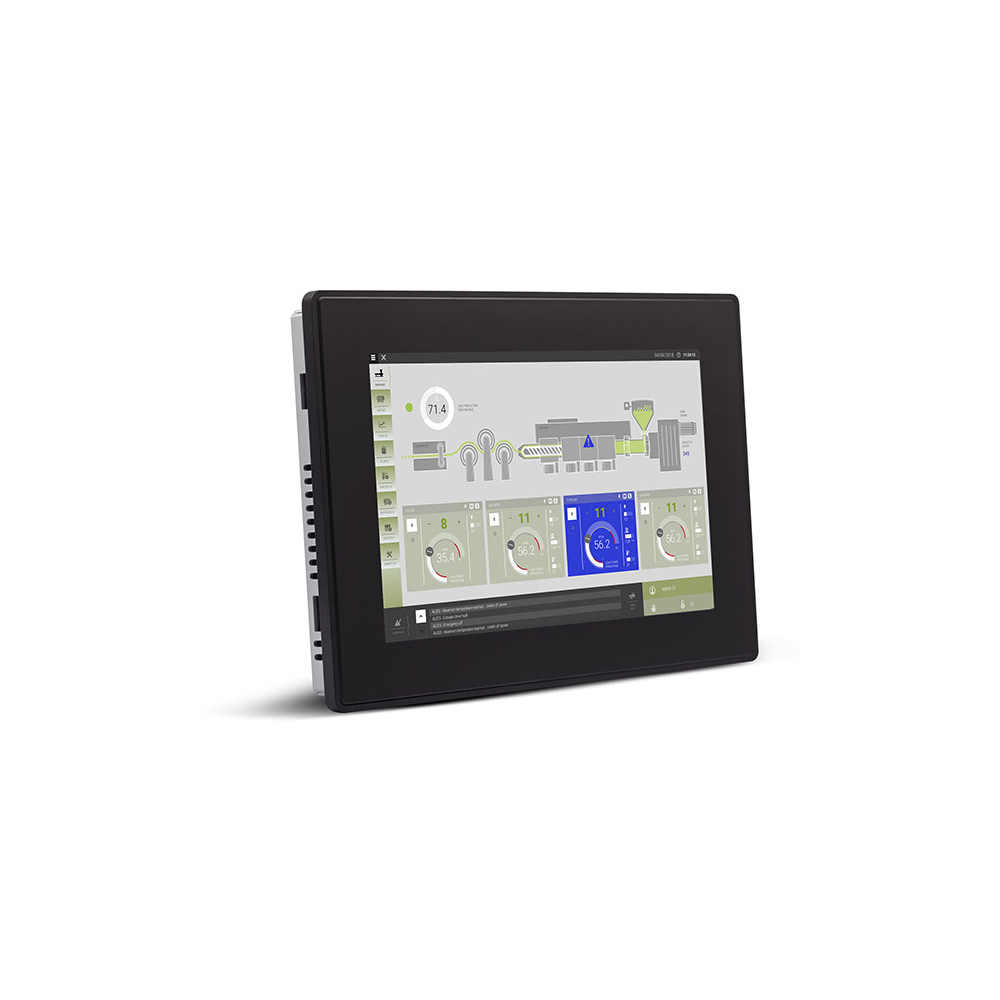 Écran large TFT couleur de 10,1" avec écran tactile capacitif projeté multitouch. 3 ports Ethernet, 1 port série, 2 ports USB. JMobile runtime.