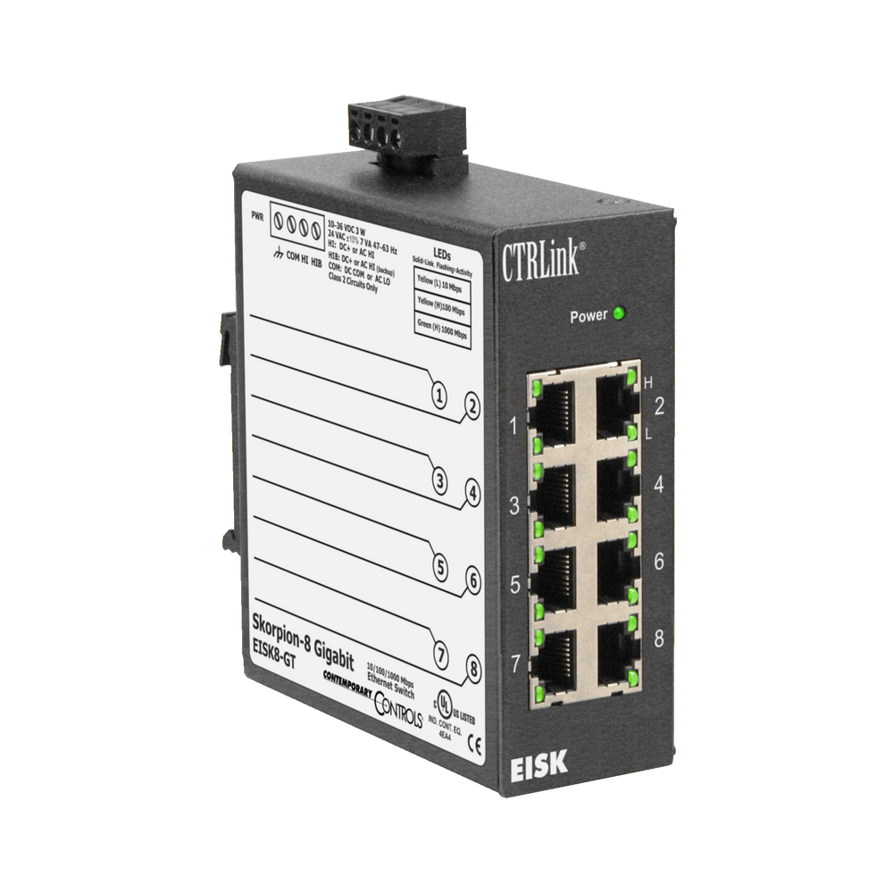Le switch Gigabit Ethernet non administré EISK8-GT de Contemporary Controls offre une vitesse Gigabit sur les 8 ports - également pour les caméras IP ou les clients réseau actuels avec les exigences les plus élevées en matière de débit de données. Il supporte en outre les "paquets Jumbo" d'une taille de 9216 octets pour une meilleure performance.
